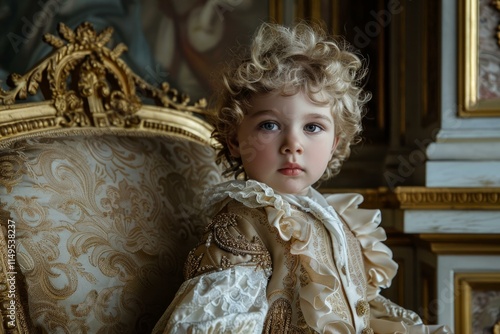 Portrait of a child prince wearing aristocratic clothes, posing on an elegant golden throne inside a palace