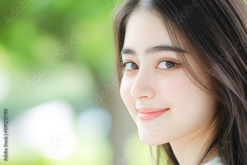 Portrait of a smiling young woman outdoor park natural light close-up joyful expression