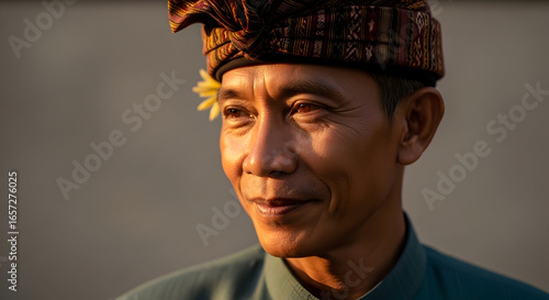 Portrait of a traditional Balinese man wearing a patterned headscarf and a blue shirt with warm sunlight highlighting his facial features and serene expression in natural outdoor setting