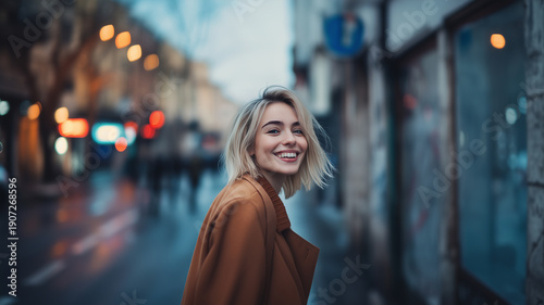 portrait of attractive blond smiling happy woman walking in street in autumn style fashion outfit wearing coat