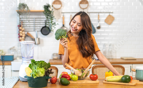 Portrait of beauty body slim healthy asian woman having fun cooking and preparing cooking vegan food healthy eat with fresh vegetable salad on counter in kitchen at home.Diet.Fitness, healthy food