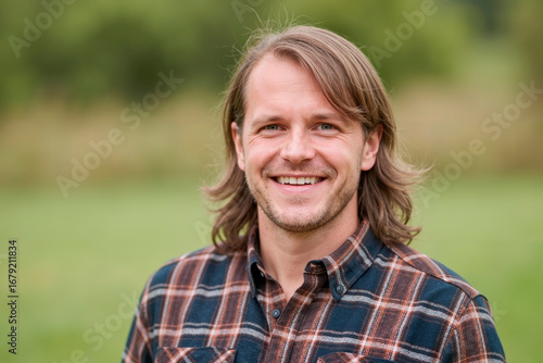 Portrait of Caucasian young adult man smiling outdoors with long hair visible, looking directly at camera, standing in natural setting with blurred green background