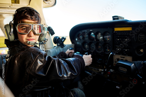 portrait of cute boy dressed in large leather pilot jacket, headset and aviator glasses, sitting in cockpit of private light single-engine airplane, looking in camera.