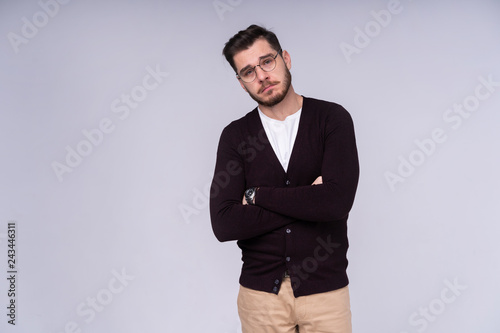 Portrait of sad upset young guy looking at camera over white background