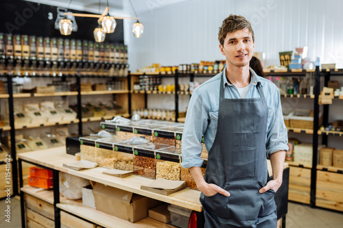 Portrait of young man owner over interior of Zero Waste Shop in Grocery Store. No plastic Conscious Minimalism