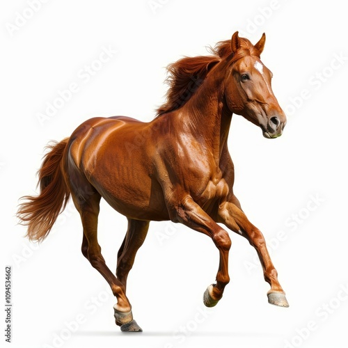 Powerful chestnut horse running with flowing mane and tail, isolated on white background