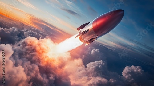 Powerful rocket launch through a vibrant sky.