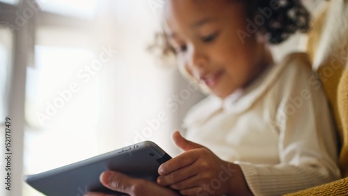 Pretty African American woman with chid using tablet device. Cute girl with curly hair talking with her mother. Looking with focus at display while searching something on Internet.