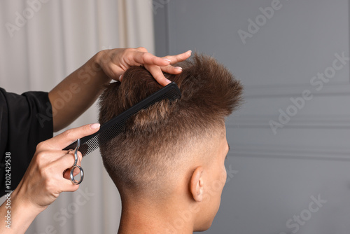 Professional barber making stylish haircut in salon, closeup