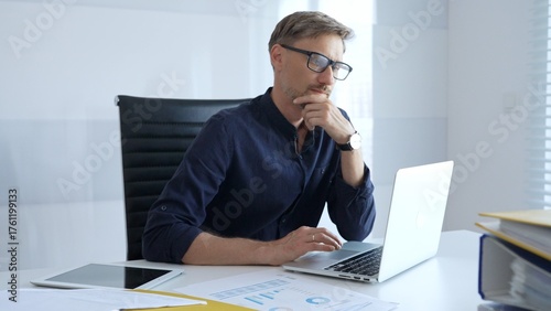 Professional businessman sitting at a sleek desk, working on a laptop and thinking about goals in modern office filled with natural light. Business people concept