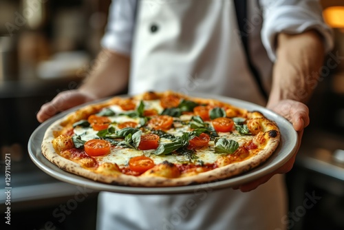 Professional chef presenting a freshly baked margherita pizza, garnished with basil and cherry tomatoes