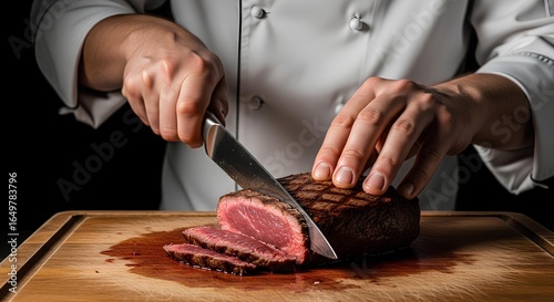 Professional chef slicing a roasted steak on a wooden cutting board. Cooking delicious meat in a restaurant kitchen with a dark background.
