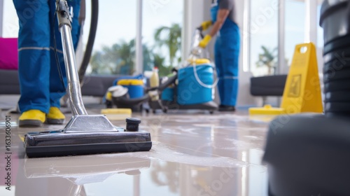 Professional Cleaning Crew Polishing and Maintaining a Modern Interior Space for a Spotless and Hygienic Environment