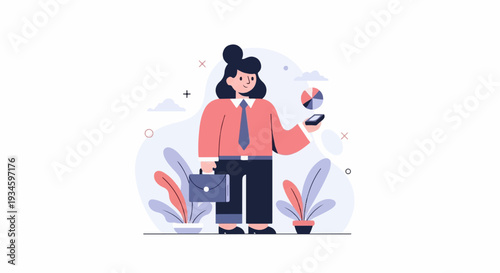 Professional woman with briefcase, phone, and pie chart, surrounded by plants