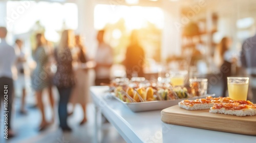 Professionals engage in conversation while enjoying food and drinks at a vibrant corporate networking event during evening hours