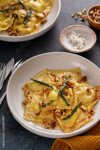Pumpkin ravioli with brown butter pecan sauce and sage