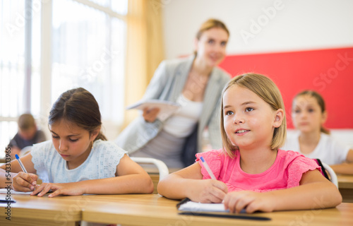 Pupils sitting in classroom during lesson. Female teacher standing behind.