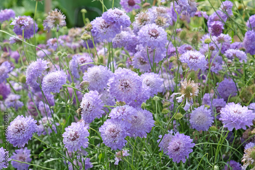 Purple and blue Scabiosa atropurpurea, ‘Oxford Blue’, Sweet Scabious in flower.