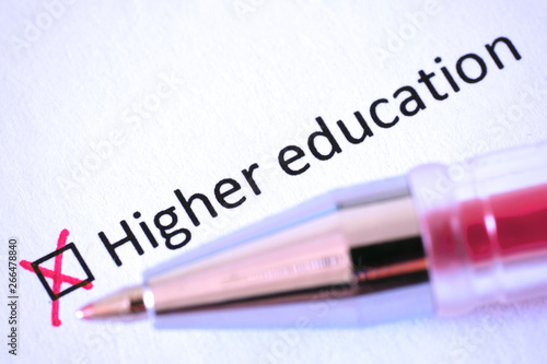 Questionnaire. Red pen and the inscription HIGHER EDUCATION with cross on the white paper