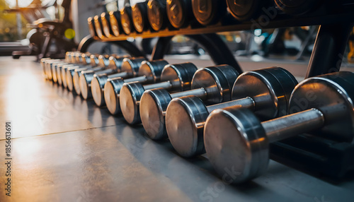Rack of Silver Dumbbells Lined Up in a Gym with Warm Sunlight Glinting on Metal Weights and Softly Blurred Background Equipment Offering a Sense of Motivation for Fitness and Strength Training