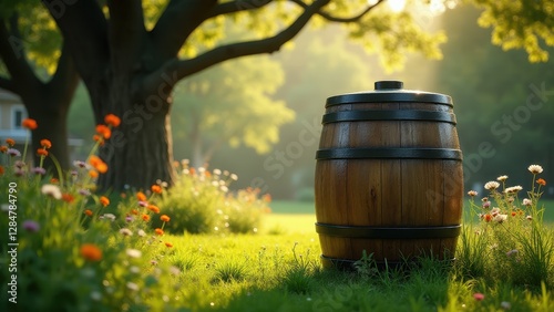 Rain Barrel, A rain barrel under bird's-eye view in a lush yard at sunrise with photorealistic textures and dew.