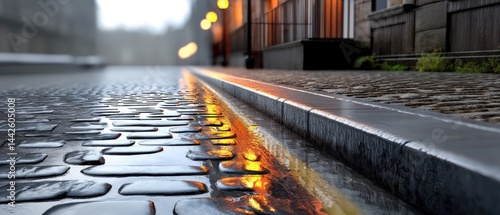 raining morning wet streets concept. Pavement glistens after rain, reflecting lights and creating a serene urban atmosphere.