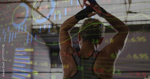 Raising athletic woman gripping overhead pull-up bar in gym, with overlaid stock market charts