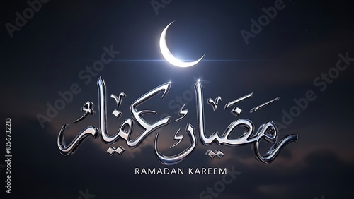 Ramadan Kareem greeting card with crescent moon and Arabic calligraphy at night
