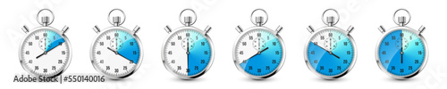 Realistic classic stopwatch icons. Shiny metal chronometer, time counter with dial. Blue countdown timer showing minutes and seconds. Time measurement for sport, start and finish. Vector illustration