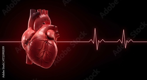 Realistic human heart with vibrant EKG heartbeat line on dark background