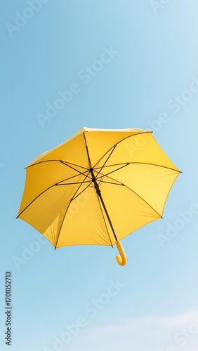 Realistic yellow umbrella floating in soft light blue sky with subtle cloud gradients, simple composition with slight texture on fabric