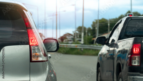 Rear side car stop and turn on brake light. Two car prepare starting from an intersection or race. Traffic jam on the road with cars on the side. blurred background of grass and pole light.