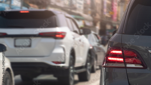 Rear side view of grey car with turn on brake signal. Can see speed of car by blurred speed of other cars and city on the road.