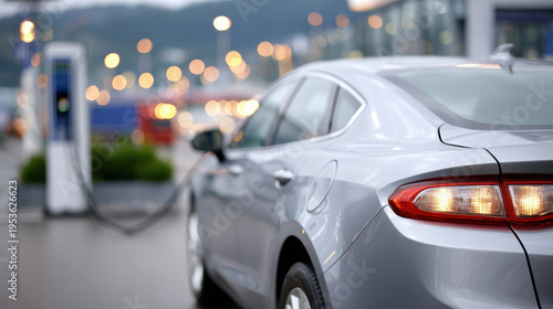 Rear side view of silver electric car plugged into charging station at dusk for sustainable transport background and eco mobility banner design