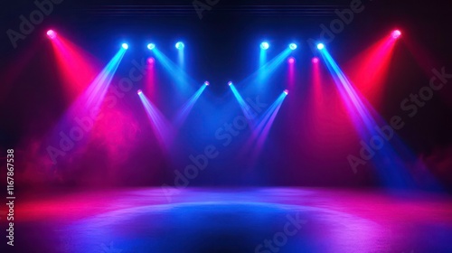 Red and blue laser light for concert background. Dance party event with lazer circle design for dj. Night strobe performance with sparkle and steam. Realistic nightlife bg. Vibrant virtual technology