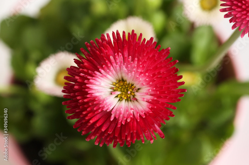 Red and white daisy flowers in a small pink bucket on a white background. View from above