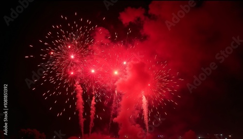 Red firecrackers bursting mid-air, capturing the explosive energy of a festive celebration.