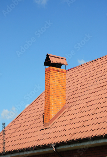 Red Metal Roof Tiles with brick chimney. Roofing Construction, roof repair.