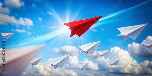Red Paper Airplane Leading White Pack: Leadership, Competition, Success Stock Photo