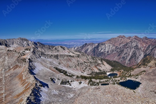 Red Pine Lake mountain landscape scenic view from White Baldy and Pfeifferhorn hiking trail, towards Little Cottonwood Canyon, Wasatch Rocky mountain Range, Utah, United States.