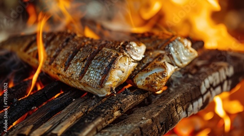 Red salmon tuna fish steak bbq cooking fry on campfire wallpaper background