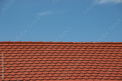 Red tiled roof with a textured surface against a clear blue sky, showcasing architectural design and craftsmanship in residential construction and home aesthetics
