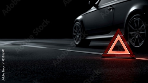 Red Warning Triangle on Road Near Black Car in Low Light Setting