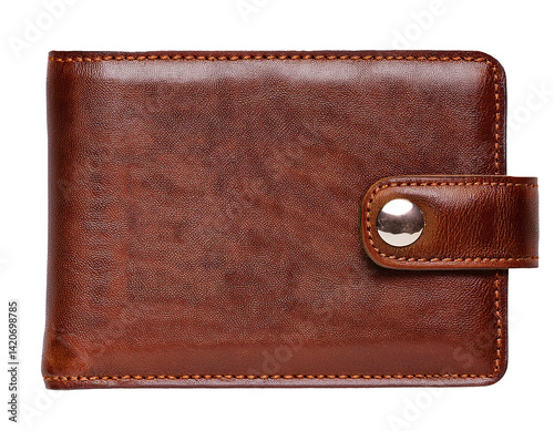 reddish tan leather bifold wallet with silver button strap on isolated background for men accessories and fashion essentials