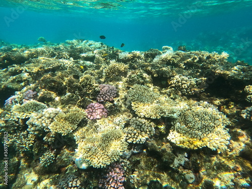 Reef with lots of colorful corals and lots of fish in clear blue water in the Red Sea near Hurgharda, Egypt