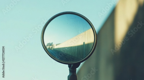 Reflection in Car Side Mirror with Urban Background Under Blue Sky