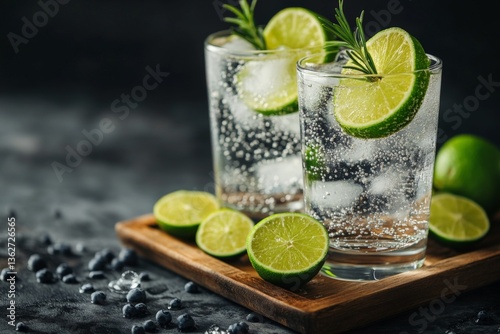 Refreshing drink served in glasses with lime and rosemary on wooden platter with blueberries