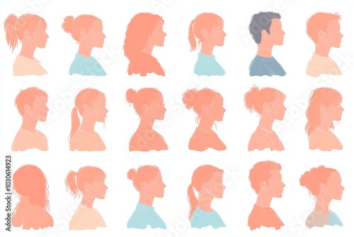 Repeated pattern of pink and peach human silhouettes in profile view against a white background exploring themes of identity anonymity and human diversity in a minimalist composition