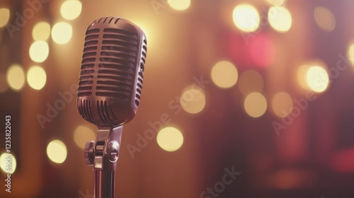 Retro steel microphone on bokeh concert stage. Vintage silver microphone on blurred background with copy space. International Podcast Day. Microphone Birthday. Concept for music apps, karaoke record
