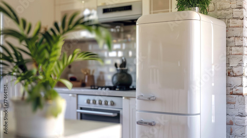 Retro style kitchen with white vintage refrigerator and indoor plants.